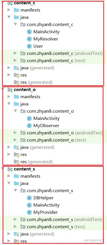 本文将以一个案例讲解使用 ContentProvider 实现跨进程通讯,项目结构如下,一共包含 3 个 Module。