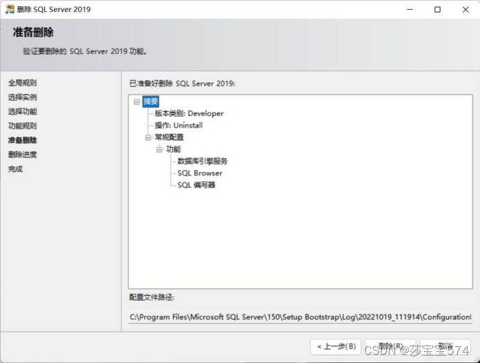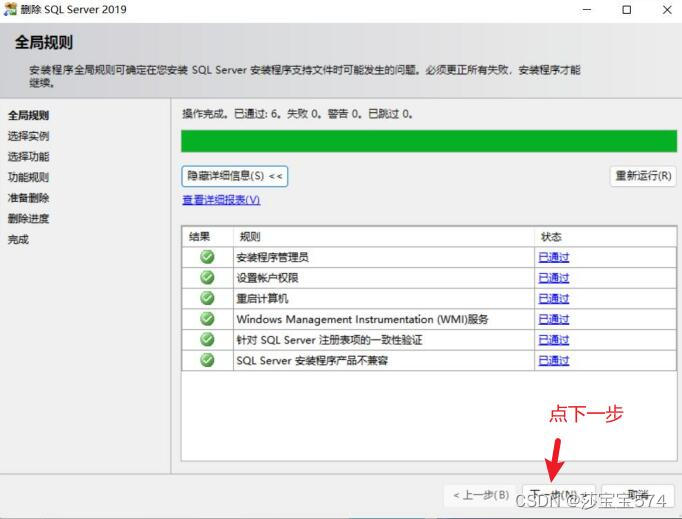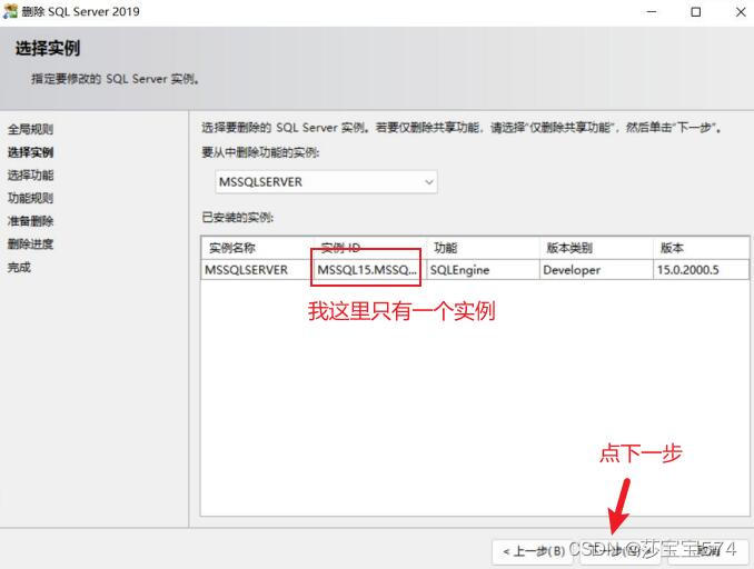 (2)此处需要特别注意,到了”选择实例”这一项的时候,实例ID有多少个,就要删除多少次,也就是说如果实例ID有两个的话,那么这一轮删除完后,再回到Microsoft SQL Server 2019(64位)这里再卸载一遍。然后点击下一步。