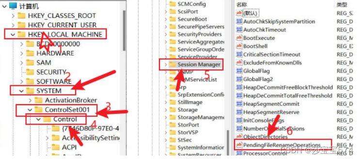 (1)找到HKEY_LOCAL_MACHINE\SYSTEM\ControlSet001\Control\Session Manager,删除右边”PendingFileRenameOperations”这一项。