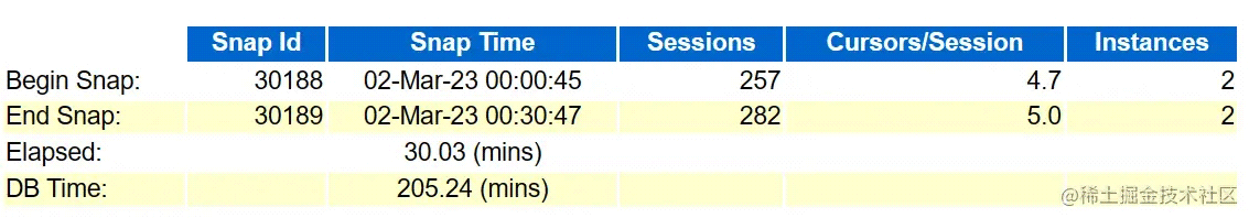 a.应用场景:开发反应2023-03-02 00:22至00:35,数据落盘慢,根据情况查看此时间段的主要活动事件,数量,与sql_id(全局) select count(*), sql_id, event, blocking_session from gv$active_session_history where sample_time between to_date('2023-03-02 00:22:00', 'yyyy-mm-dd hh24:mi:ss') and to_date('2023-03-02 00:35:00', 'yyyy-mm-dd hh24:mi:ss') group by sql_id, event, blocking_session order by 1; (非全局)BLOCKING_INST_ID--被阻塞者, blocking_session--阻塞者 select count(*), sql_id, event, BLOCKING_INST_ID, blocking_session from v$active_session_history where sample_time between to_date('2023-03-02 00:20:00', 'yyyy-mm-dd hh24:mi:ss') and to_date('2023-03-02 00:35:00', 'yyyy-mm-dd hh24:mi:ss') group by sql_id, event, BLOCKING_INST_ID, blocking_session order by 1; b.现在我们已经得到两个关键信息:sql_id与阻塞事件,首先根据sql_id我们可以再进一步使用此视图,实际中可以多调整几个较小的时间段,以突出最有代表的信息 select count(*), session_id, session_serial#, sql_id, event, BLOCKING_INST_ID, blocking_session from v$active_session_history where sample_time between to_date('2023-03-02 00:24:00', 'yyyy-mm-dd hh24:mi:ss') and to_date('2023-03-02 00:25:00', 'yyyy-mm-dd hh24:mi:ss') and sql_id = '1xfbtdvu3xb67' group by session_id, session_serial#, sql_id, event, BLOCKING_INST_ID, blocking_session order by 3; c.加入等待事件后更清晰 select count(*), session_id, sql_id, event, BLOCKING_INST_ID, blocking_session from v$active_session_history where sample_time between to_date('2023-03-02 00:25:00', 'yyyy-mm-dd hh24:mi:ss') and to_date('2023-03-02 00:35:00', 'yyyy-mm-dd hh24:mi:ss') and event = 'library cache lock' and sql_id = '1j47z0mc6k02b' group by session_id, sql_id, event, BLOCKING_INST_ID, blocking_session order by 1; 结论:可以看出大量并发等待,最终是发现有什么阻塞了此SQL语句