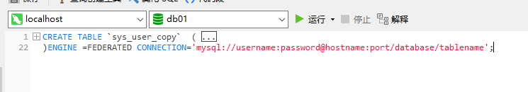CREATE TABLE (......) ENGINE =FEDERATED CONNECTION='mysql://username:password@hostname:port/database/tablename'