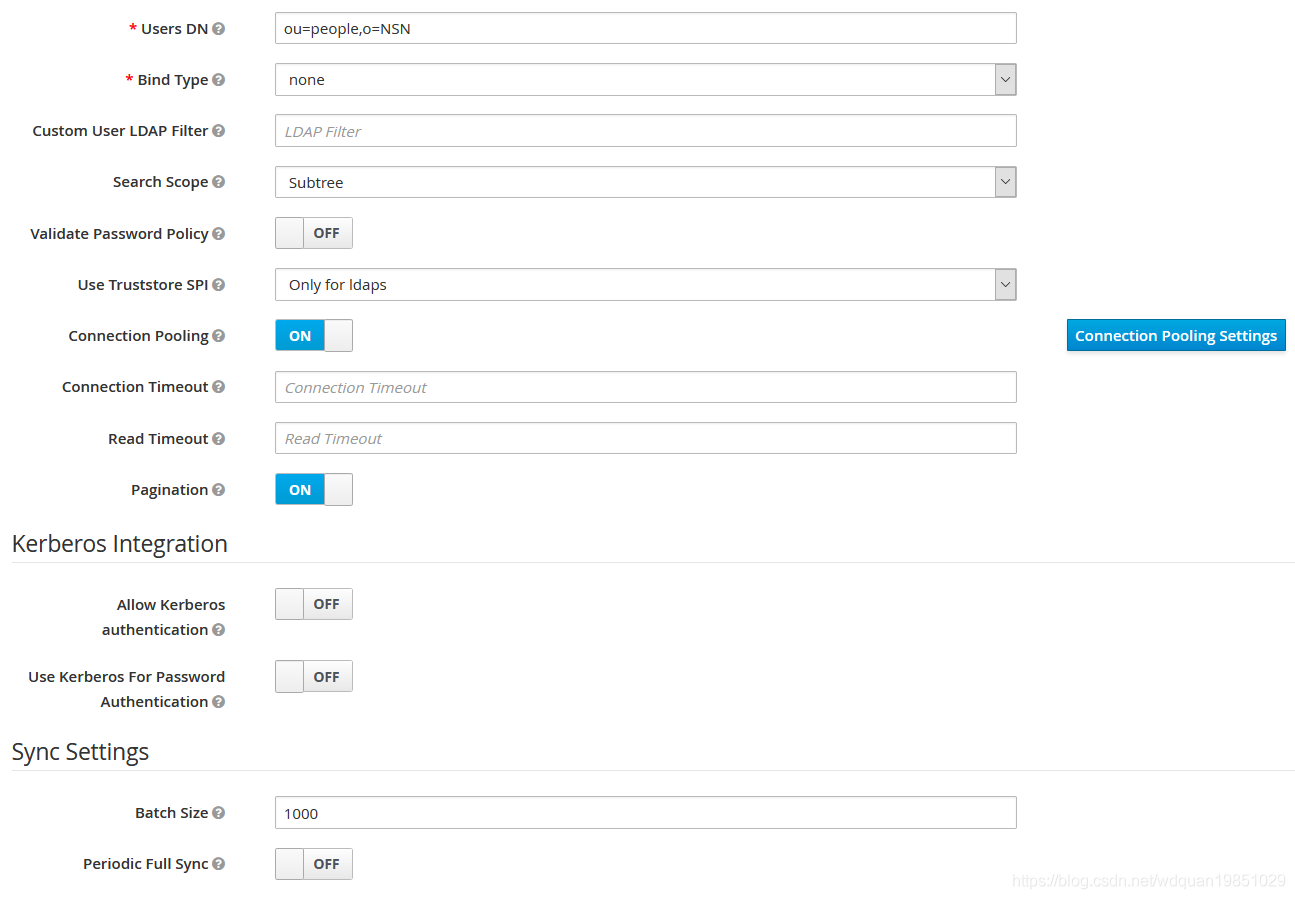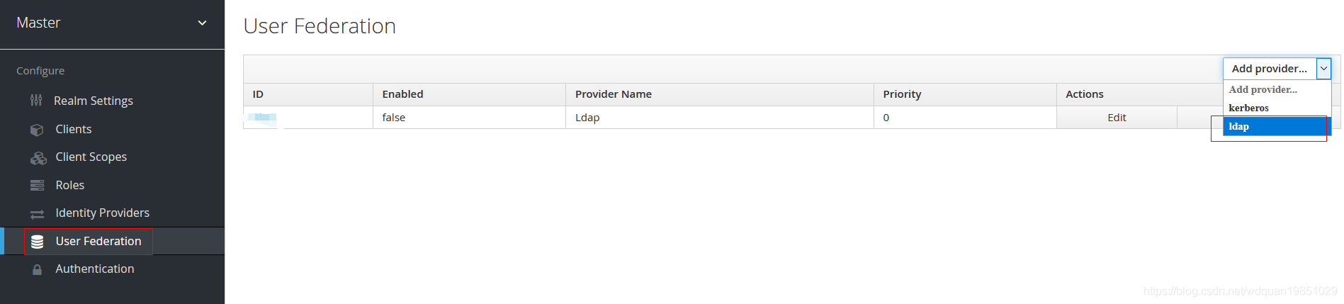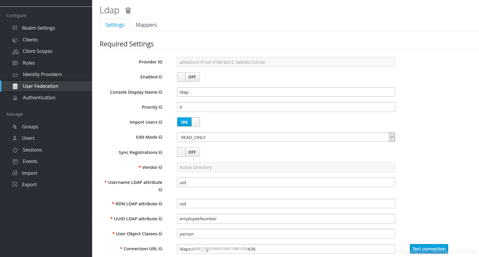 用户可以在keycloak中直接创建新的User,也可以使用外部已有的User数据,例如mysql,LDAP中存储的用户信息,下面给出一个配置LDAP的例子。