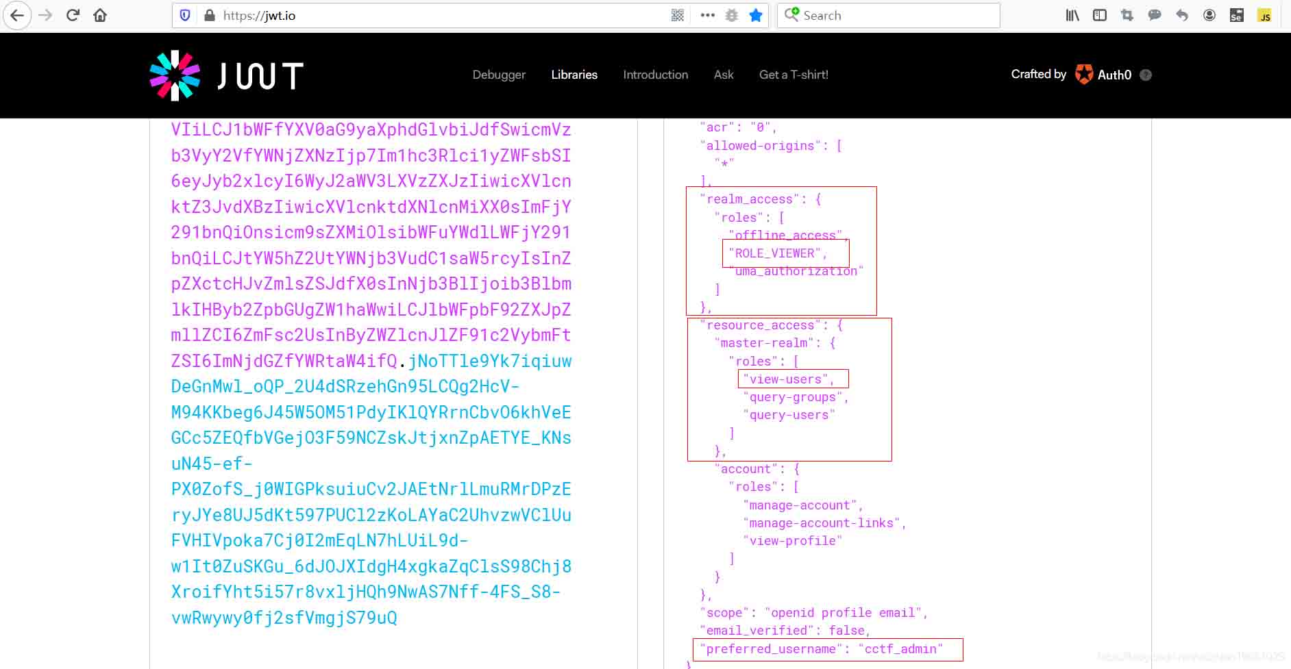 }在网站JSON Web Tokens - jwt.io中解析access token,发现能获取到realm role信息,以及资源访问权限 resource_access等信息。