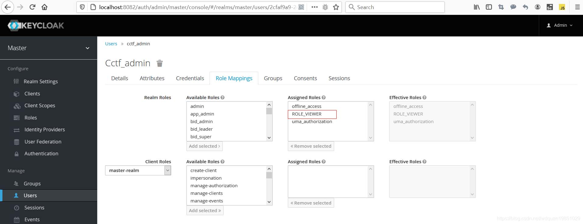 给用户添加role信息,下图中给用户cctf_admin添加了 ROLE_VIEWER 这个Realm Role。