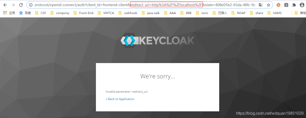 例如下面的错误,应用程序的地址为: http://localhost/,但是未在client中配置正确的redirect_url,会出现下面的错误。