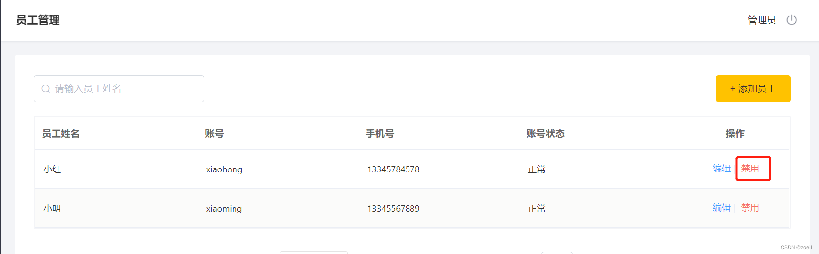 在下面这个后台管理中,当我们点击禁用后,会向服务器发送一个请求,同时携带这个员工的19位数字的id。