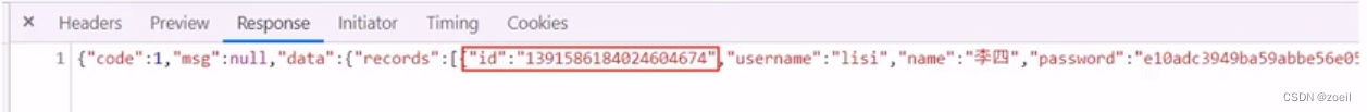 我们可以在服务端给页面响应json数据时进行处理,将long型数据统一转为String字符串,效果如下: