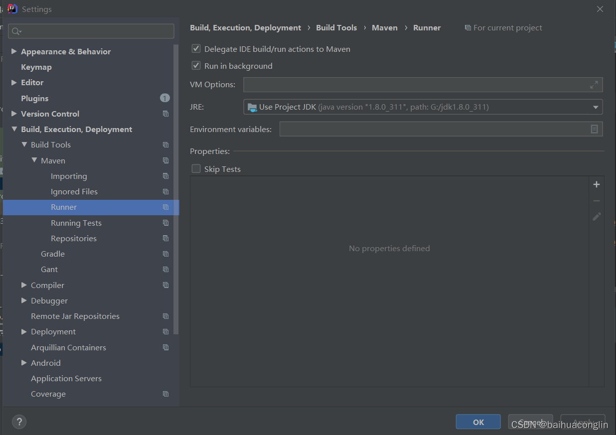 1 点击file-> settings. ->Build, Execution, Deployment–>Build Tools–>Maven–>Runner,勾选delegate IDEA build/run actions to maven(将idea的运行权限委托给maven)