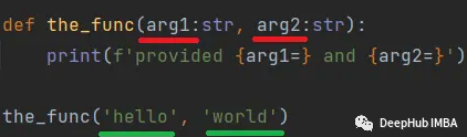 print(f'provided {arg1=}, {arg2=}')