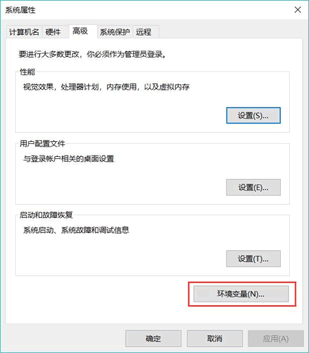如上图所示,点击“环境变量”按钮,此时将弹出下图所示的对话框: