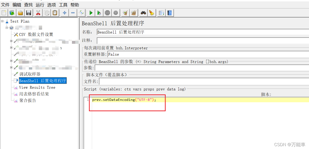 在查看结果树的前面,添加一个后置处理器-Beanshell PostProcessor,在脚本中添加prev.setDataEncoding(“UTF-8”);