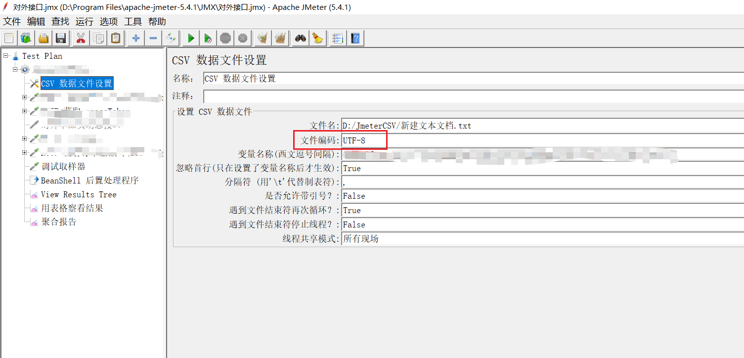 遇到的问题:csv文件中有的用户名是中文的,接口使用该用户名入参时,查看结果树中看到,中文名显示为一堆乱码。