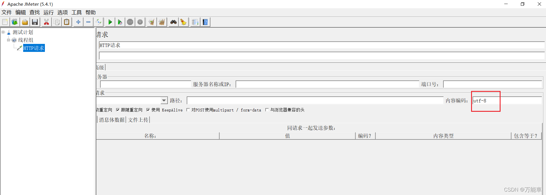 **解决的方法:**HTTP请求配置页,编码格式设置为utf-8