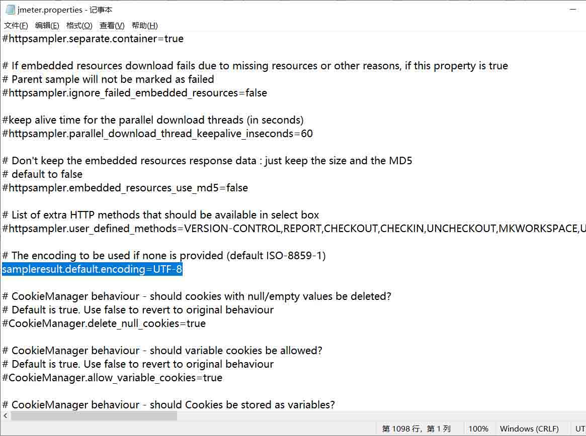修改jmeter的配置文件,将请求返回的默认编码方式修改为UTF-8