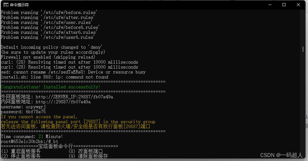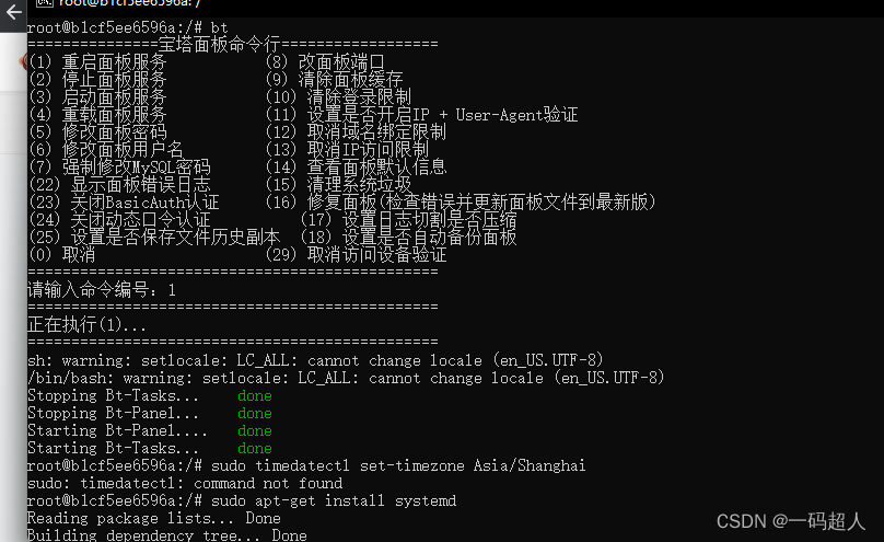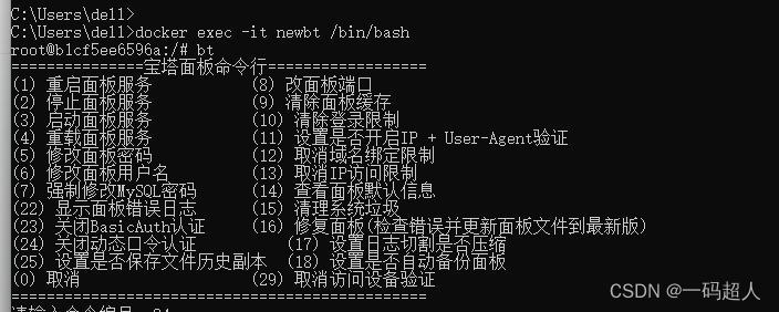 注意:你会发现容器运行以后依然无法通过浏览器访问,是因为宝塔没有启动,进入容器输入如下命令。