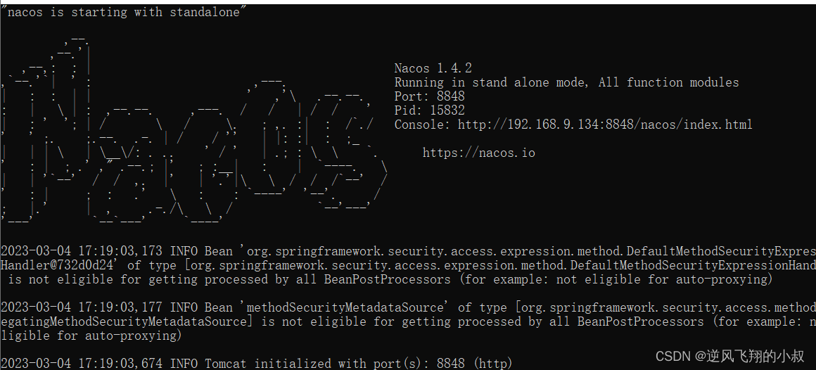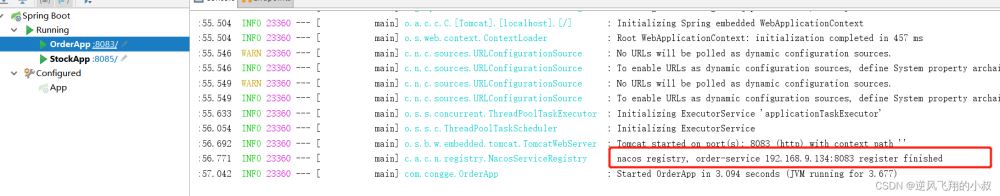 启动nacos,然后依次启动stock服务,order服务,在工程启动的时候,注意下面的关键信息,说明服务注册到了nacos;