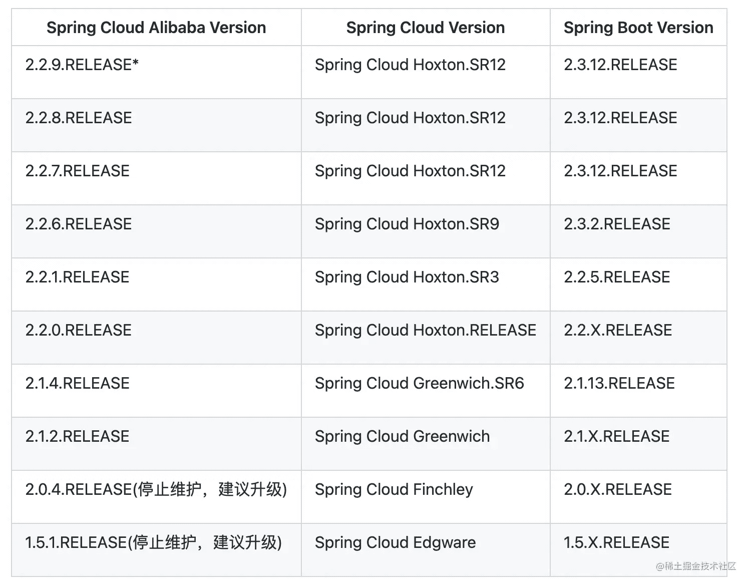 下面摘取git中关于各个版本选型的详细对照,git地址:各版本依赖关系地址,最重要的就是springboot的版本与Spring Cloud Alibaba 版本的依赖关系;