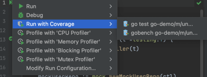 当然,如果你和我一样使用 goland 进行开发,可以直接在界面上点击单元测试,就可以快速进行覆盖率测试,并且展示也很方便,很快能看到有哪些代码没有被测试覆盖。
