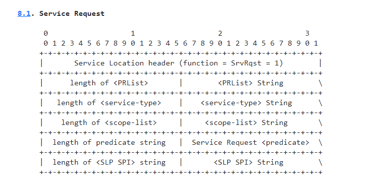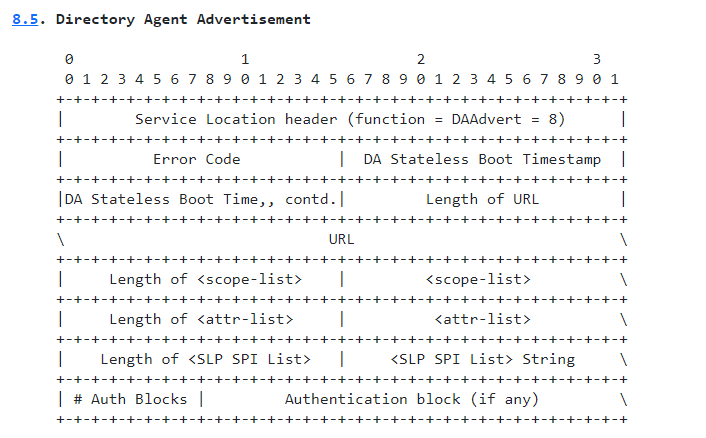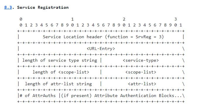 设备还可以通过发出提供相同 URL 的“属性请求”来收集有关服务的其他属性和元数据。要添加到目录中的设备可以提交“服务注册”。此请求将包括发布公告的设备的 IP、服务类型以及要共享的任何元数据等信息。SLP 可以执行更多功能,但我感兴趣的最后一个消息类型是“目录代理通告”,因为这是漏洞所在。“目录代理通告”是由服务器发送的广播消息,让网络上的设备知道如果他们想要查询服务及其位置,应该联系谁。要了解有关 SLP 的更多信息,请参阅此处和该内容。