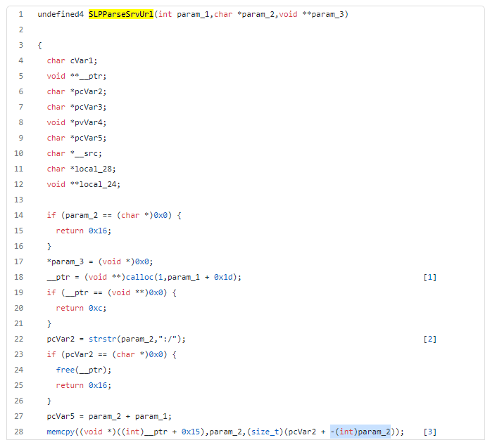 该问题出在“SLPParseSrvURL”函数中,该函数在处理“目录代理通告”消息时被调用。
