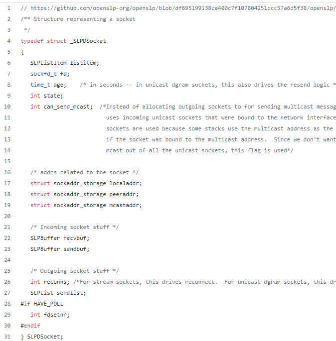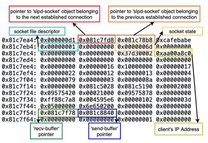 连接到“slpd”守护程序的所有客户端都将在堆上创建一个“slpd-socket”对象。此对象包含有关连接的当前状态的信息,例如它是处于读取状态还是写入状态。此对象中存储的其他重要信息包括客户端的 IP 地址、用于连接的套接字文件描述符、指向此特定连接的“recv-buffer”和“send-buffer”的指针,以及指向从先前和将来建立的连接创建的“slpd-socket”对象的指针。此对象的大小固定为 0xd0,无法更改。