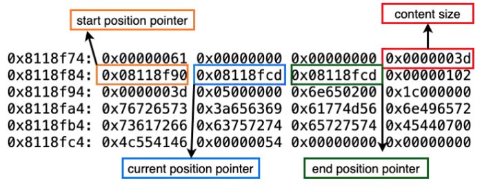 从服务器接收的所有 SLP 消息类型将创建至少两个 SLPBuffer 对象。一个称为“recv-buffer”,它存储服务器从客户端接收的数据。由于我可以控制从客户端发送的数据的大小,因此我可以控制“recv-buffer”的大小。另一个SLPBuffer对象称为“send-buffer”。此缓冲区存储将从服务器发送到客户端的数据。“发送缓冲区”具有固定的0x598大小,我无法控制其大小。此外,SLPBuffer 具有元数据属性,指向所述数据的起始位置、当前位置和结束位置。