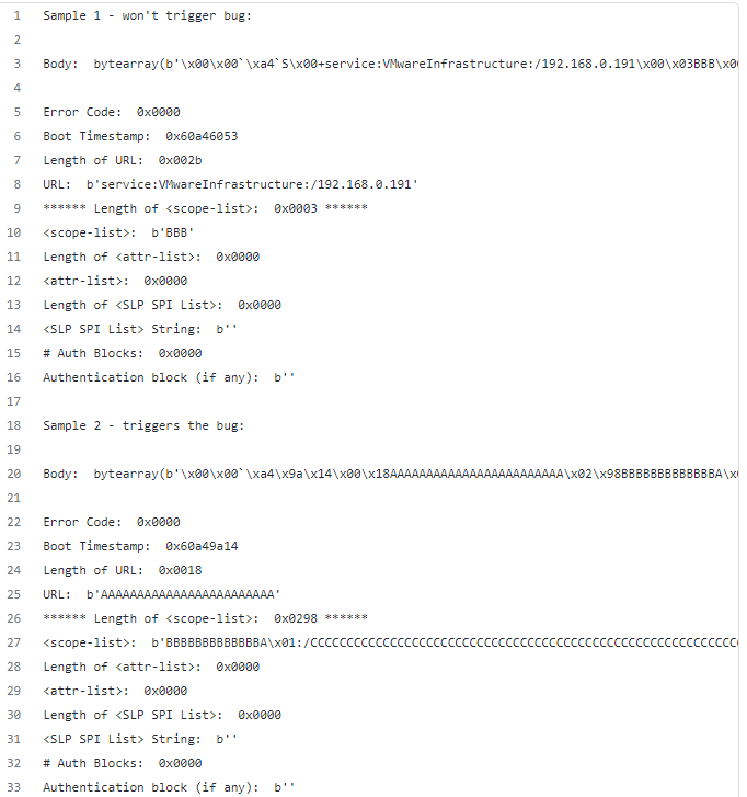我推测VMware测试用例只尝试长度小于256的“范围”。如果我们查看以下“目录代理通告”布局代码段,我们会看到示例 1 的“范围”长度包含一个空字节。这个空字节意外地充当了“URL”的字符串终止符,因为它紧随其后。如果 'scopes' 的长度高于 256,则长度的十六进制表示形式将没有空字节(如示例 2 所示),因此 'strstr' 函数将读取传递的 'URL' 并继续查找子字符串 “:/”在“范围”中。