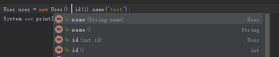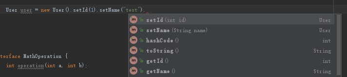如上图可以看出,和常规的get和set方法名称一致,不过区别就是set方法返回的是对象名称,更加的直观,适合对象赋值时的连续赋值参数。