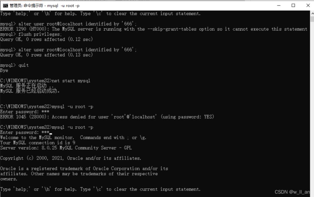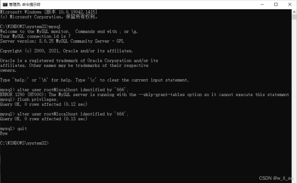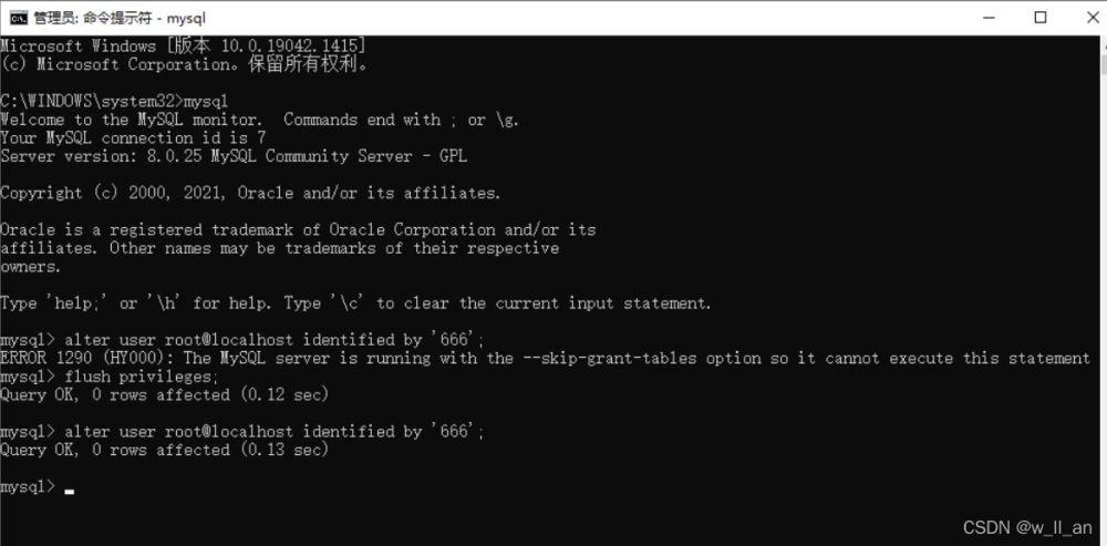 2. alter user root@localhost identified by '666';