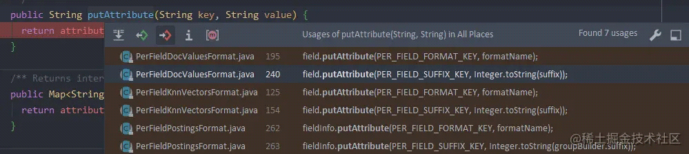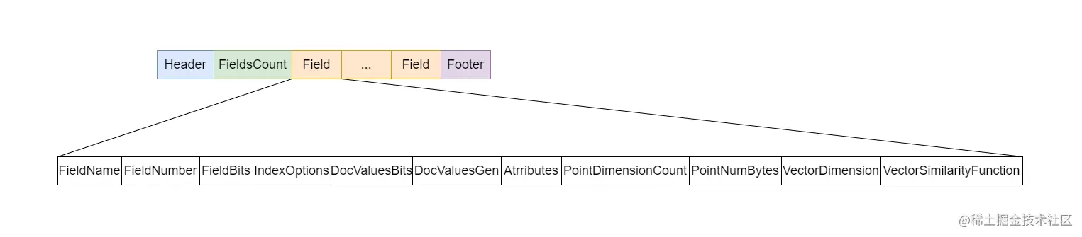 - 该文件使用的codec名称:Lucene90FieldInfos(codec可以理解成文件的布局格式,不同版本lucene相同后缀文件有不一样的版本格式)