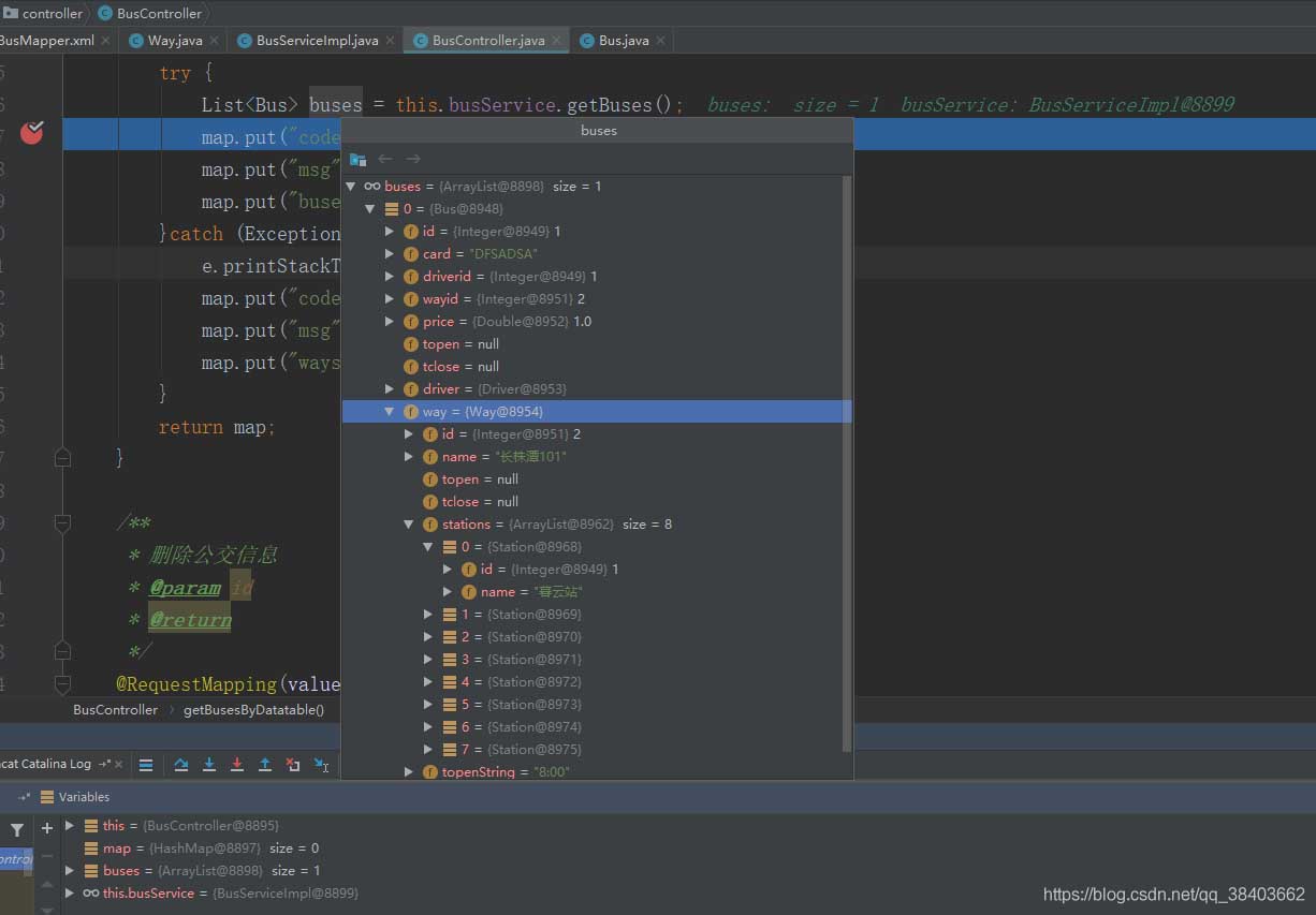 从图中也是可以看出Bus中的Way对象是有数据的,并且Way中的泛型集合stations也是有数据的,这是因为子查询中的结果集也配置了嵌套查询,所以相对于嵌套了两次~