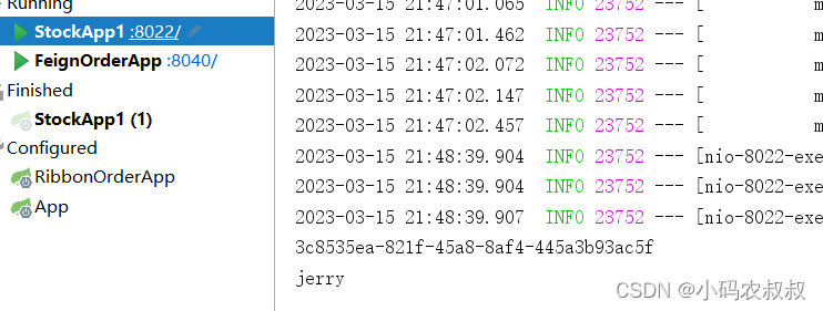 启动stock-service的两个工程,再启动order模块,启动完成后,浏览器进行接口调用