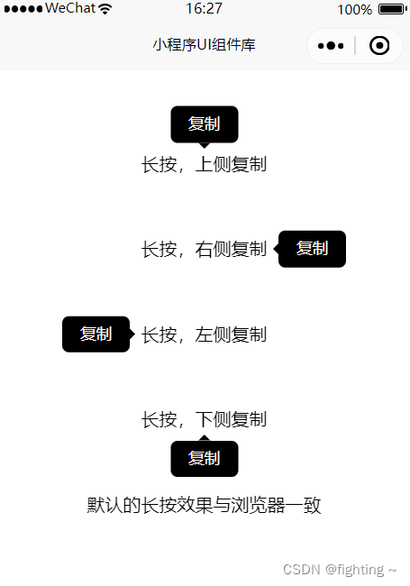<view bind:tap="handleTap"> <view class="demo-block"> <block wx:for="{{arr}}" wx:key="placement"> <view class="list-item"> <mp-select-text show-copy-btn placement="{{item.placement}}" value="{{item.value}}" data-id="{{index}}" bindcopy="onCopy" on-document-tap="{{evt}}" > </mp-select-text> </view> </block> <view class="list-item"> <mp-select-text value="默认的长按效果与浏览器一致"></mp-select-text> </view> </view> </view>