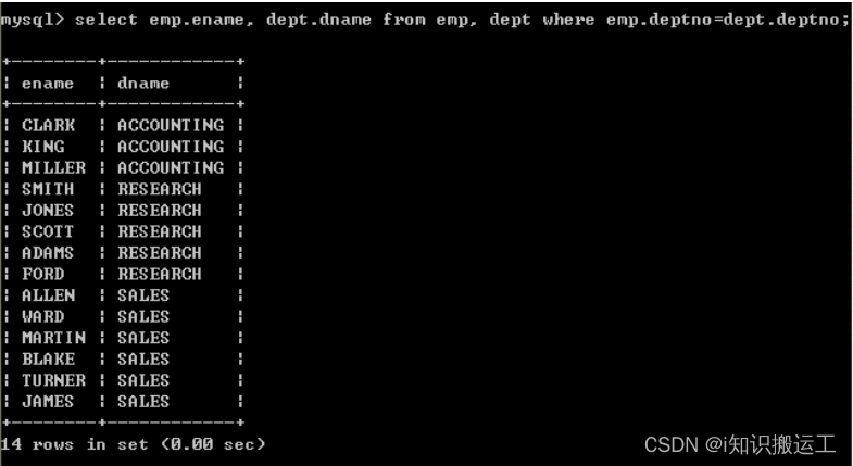 - emp表和dept表联合起来查询数据,从emp表中取员工名字,从dept表中取部门名字