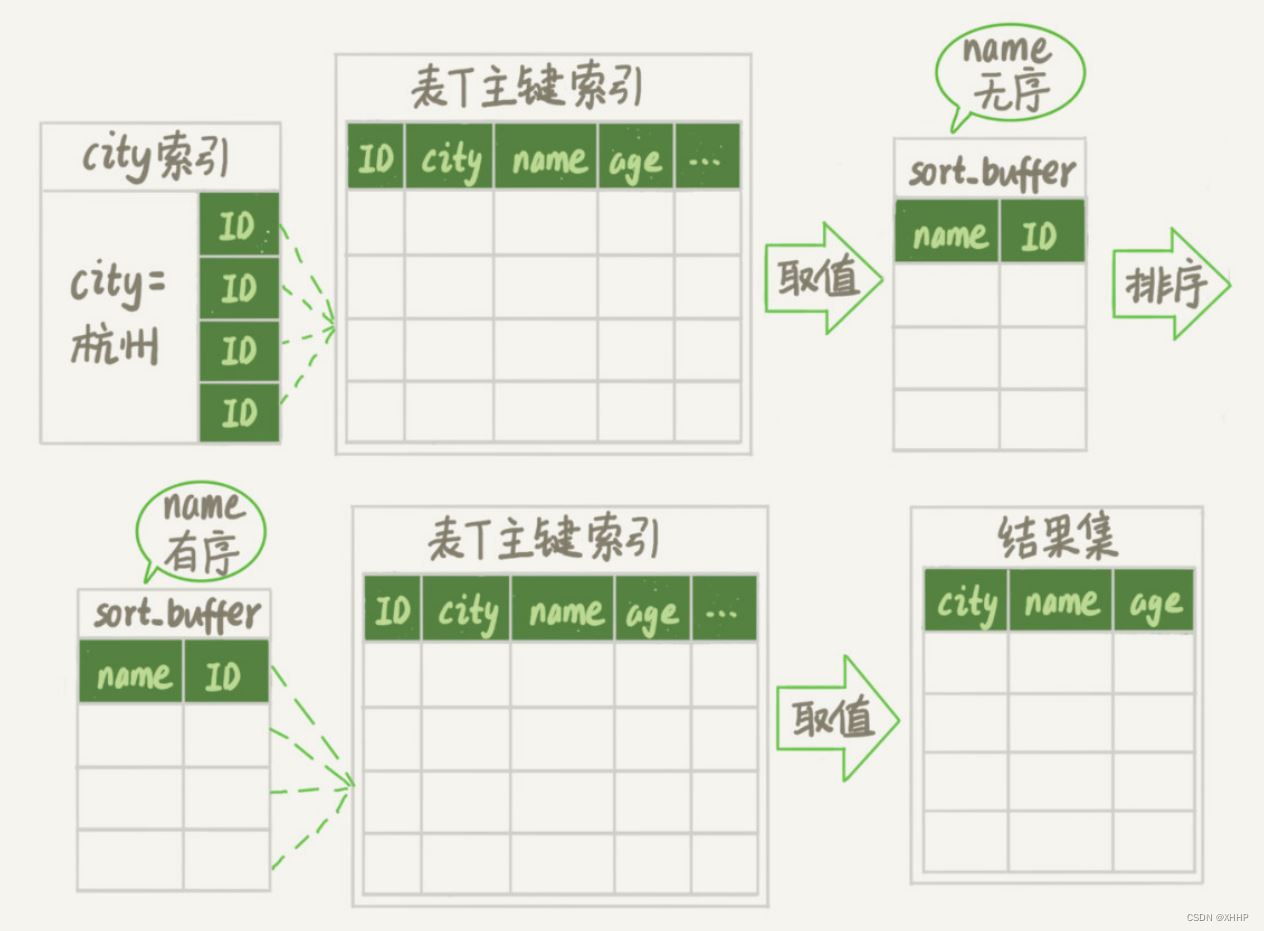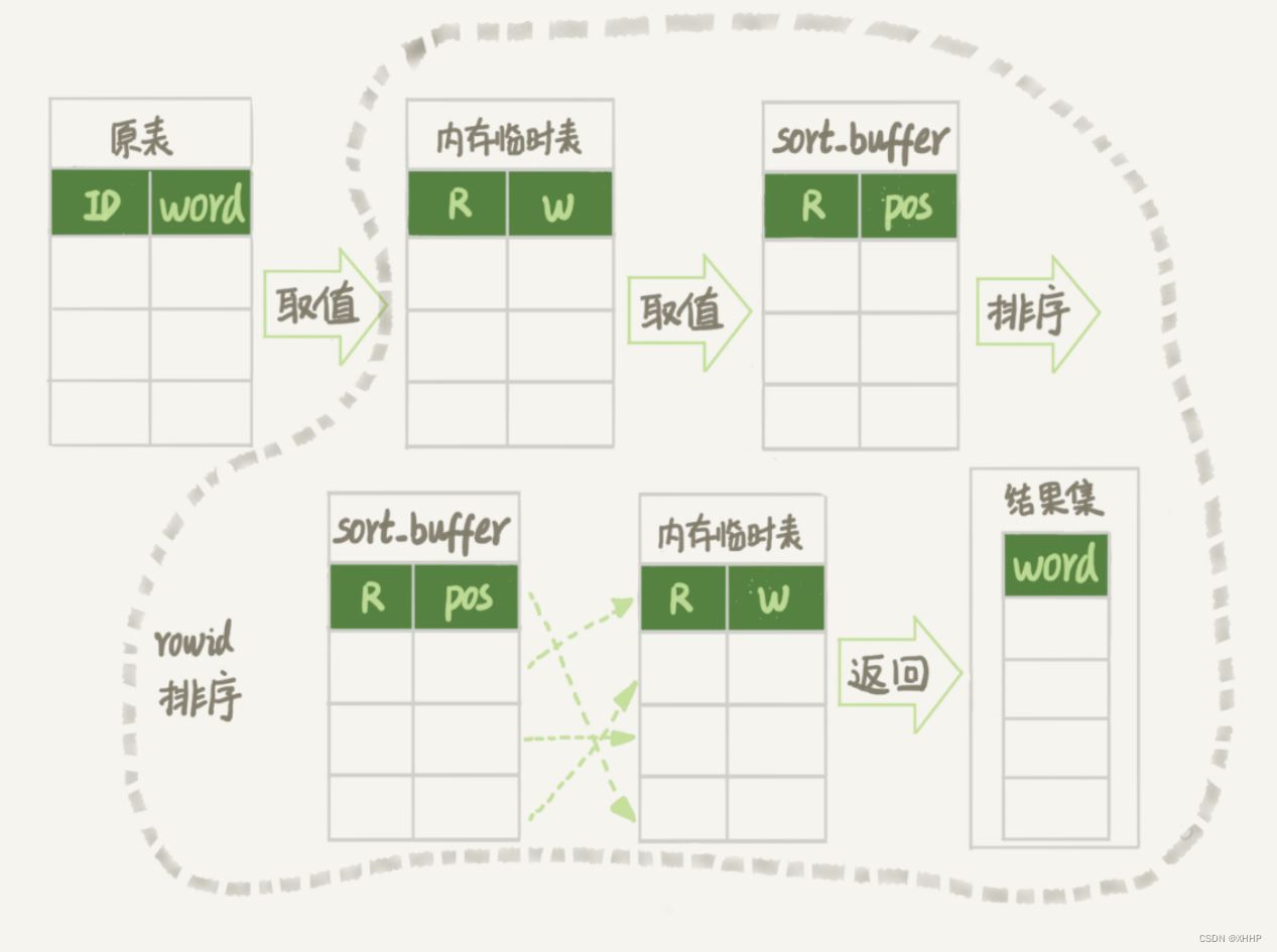 - 从内存临时表中一行行取出R值和位置信息,分别存入sort_buffer的两个字段里。