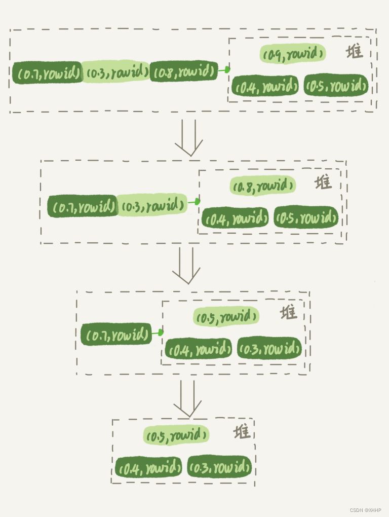 - 对于这10000个准备排序的(R,rowid),先取前三行,构造成一个堆,并且将最大的值放在堆顶;