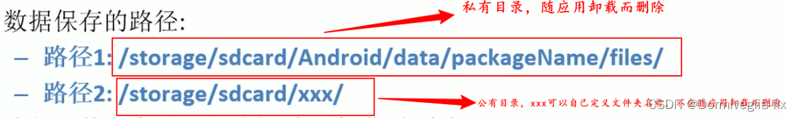 // 获取外部存储地址的位置并创建文件: new File(getExternalFilesDir(Environment.DIRECTORY_DOWNLOADS) // 存 OutputStream outputStream = null; try { outputStream = new FileOutputStream(new File(getExternalFilesDir(Environment.DIRECTORY_DOWNLOADS), 'test2')); String nameAndPassword = username + "." + password; byte[] bytes = nameAndPassword.getBytes(); outputStream.write(bytes); } catch (Exception e) { e.printStackTrace(); } finally { if (outputStream != null) { try { outputStream.close(); } catch (IOException e) { e.printStackTrace(); } } } // 取 FileInputStream fis = null; try { //第一个参数:文件目录 第二个参数:文件名 //getExternalFilesDir(Environment.DIRECTORY_DOWNLOADS)对应的路径为: // /storage/emulated/0/Android/data/com.example.customviewproject/files/Download File file = new File(getExternalFilesDir(Environment.DIRECTORY_DOWNLOADS), fileName); fis = new FileInputStream(file); //判断当前文件的字节个数 byte[] bytes = new byte[fis.available()]; while (fis.read(bytes) != -1) { String message = new String(bytes); String[] split = message.split("\\."); tv_message.setText("用户名:" + split[0] + "\n" + "密码:" + split[1]); } } catch (Exception e) { e.printStackTrace(); } finally { if (fis != null) { try { fis.close(); } catch (IOException e) { e.printStackTrace(); } } }