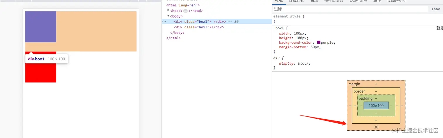 盒子垂直方向的margin是存在塌陷问题,box2设置的10px向上的margin没起作用。所以,把box1和box2变成一个BFC就可以解决这个问题。