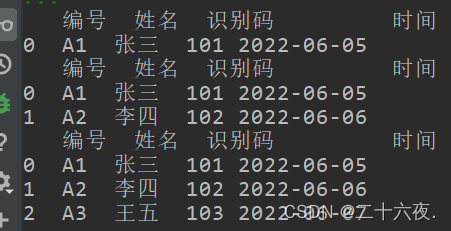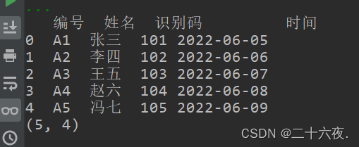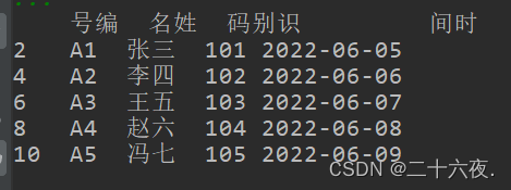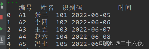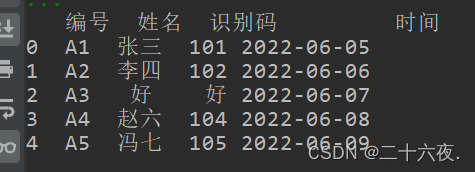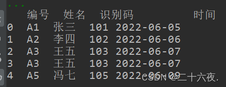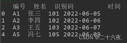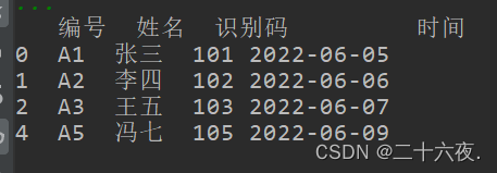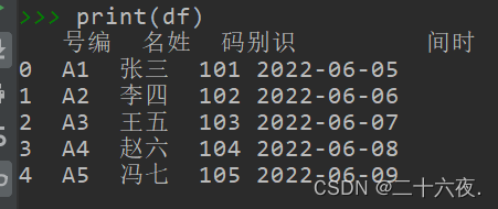 df.columns=['号编','名姓','码别识','间时']print(df)