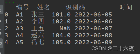 输出后的内容可以看到,王五所对应的识别码为NaN,这就表示该单元格无内容,是空的,即所说的缺省值。