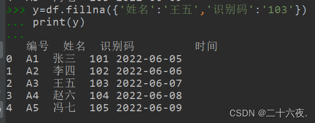 y=df.fillna({'姓名':'王五','识别码':'103'})#指定列填入值,且可以多列填写,但都写在同一个字典里