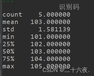 该方法能够帮助我们查看某一列int64类型数据的个数、平均数、标准差、最大值、最小值、分位数。