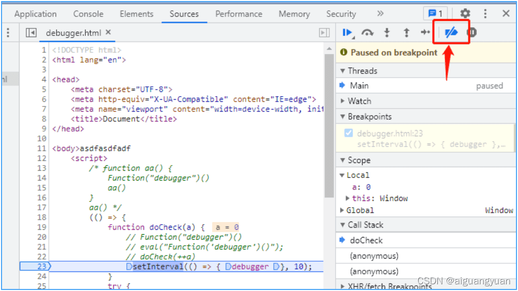 遇到防止调试我们可以禁止断点,在 Chrome 控制台的 Source Tab 页点击 Deactivate breakpoints 按钮或者按下 Ctrl + f8。
