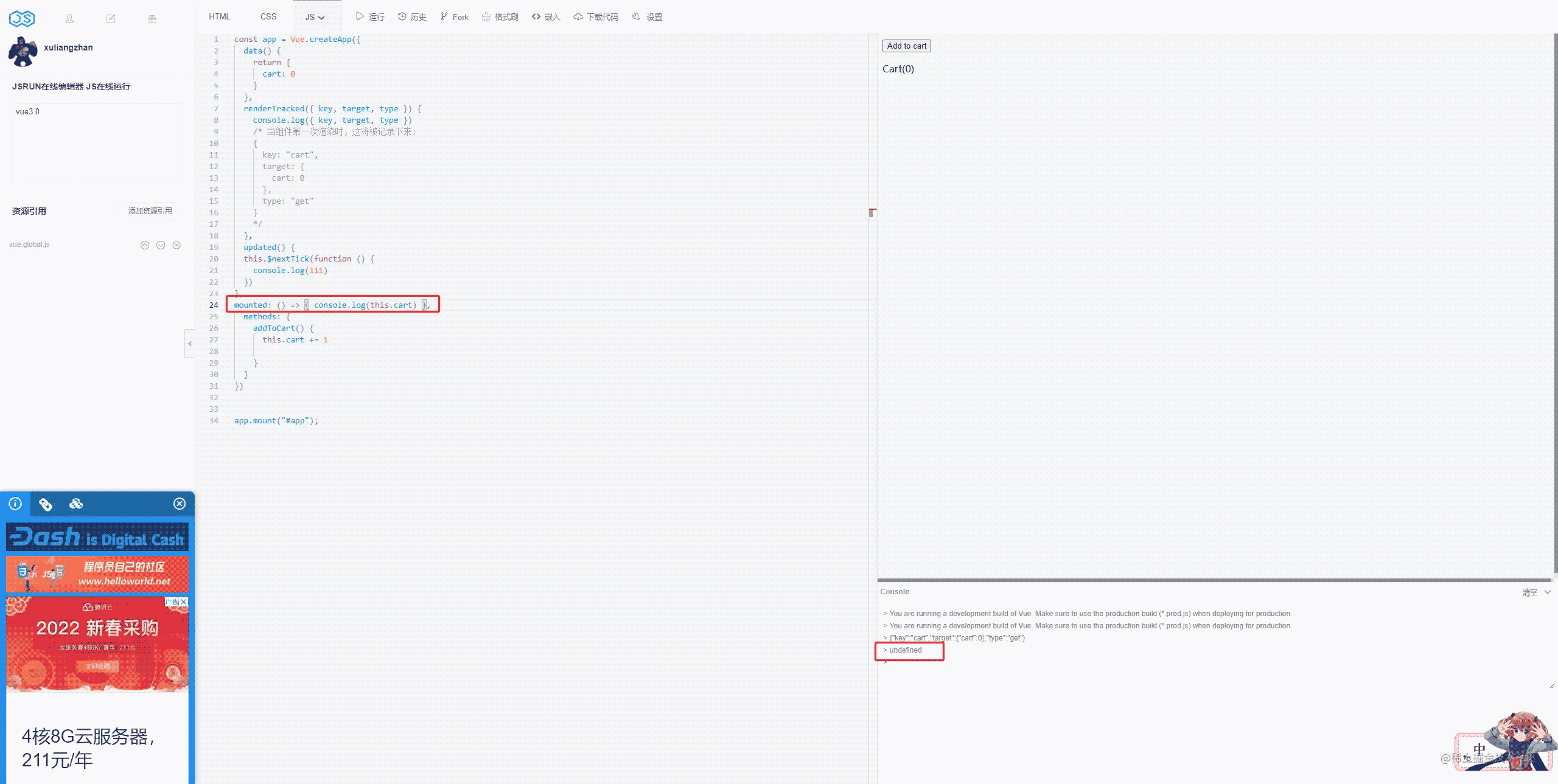 mounted: () => { console.log(this.cart) },