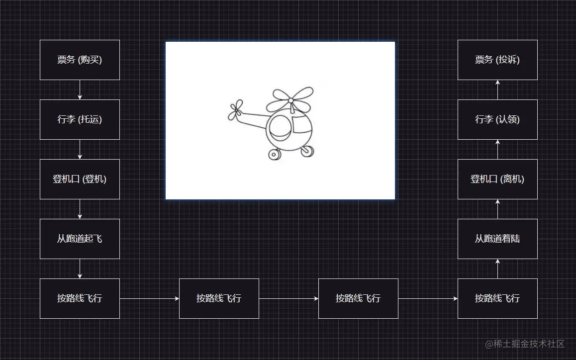描述这种系统的一种方式是,描述当你乘某个航班时,你乣采取的一系列动作,你要购买机票,托运行李,去登机口,并最终登上这次航班。该飞机起飞,飞行到目的地。当飞机着落后,你从登机口离机并认领行李。如果这次行程不理想,你向票务机构投诉这次航班(当然你的努力并没有什么卵用)