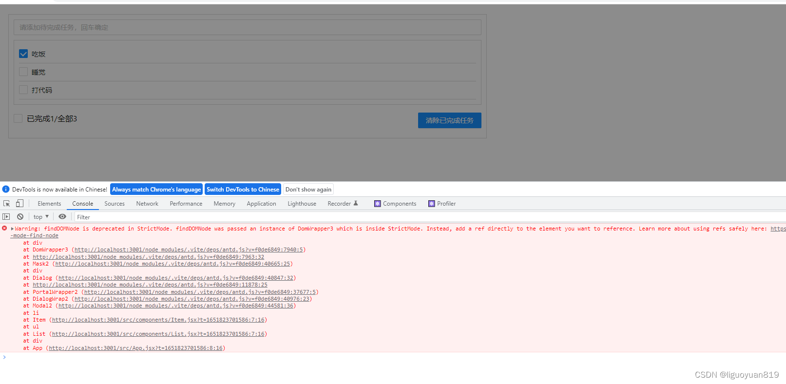 react脚手架中开启了严格模式,限制代码书写规范。在ant-design组件库中使用了CSSTransition,但是CSSTransition中的部分代码的写法对于react而言,不是最新的写法,不是非常规范的写法,所以严格模式下的react就会抛出警告。