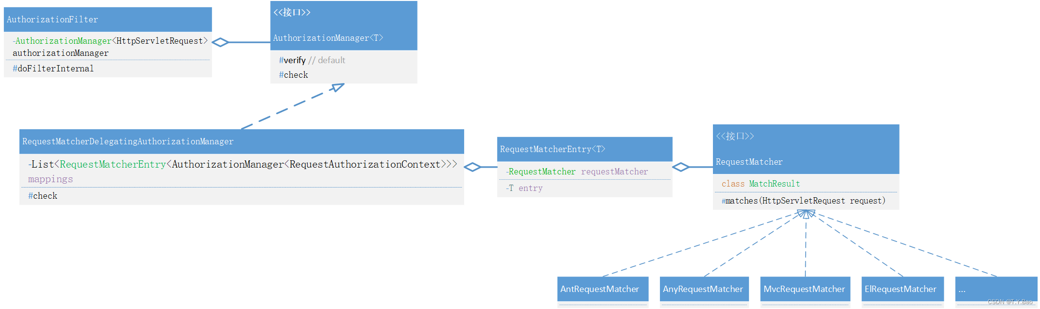 AuthorizationManager最常用的实现类为RequestMatcherDelegatingAuthorizationManager,其中会根据你的配置生成一系列RequestMatcherEntry,每个entry中包含一个匹配器RequestMatcher和泛型类被匹配对象。
