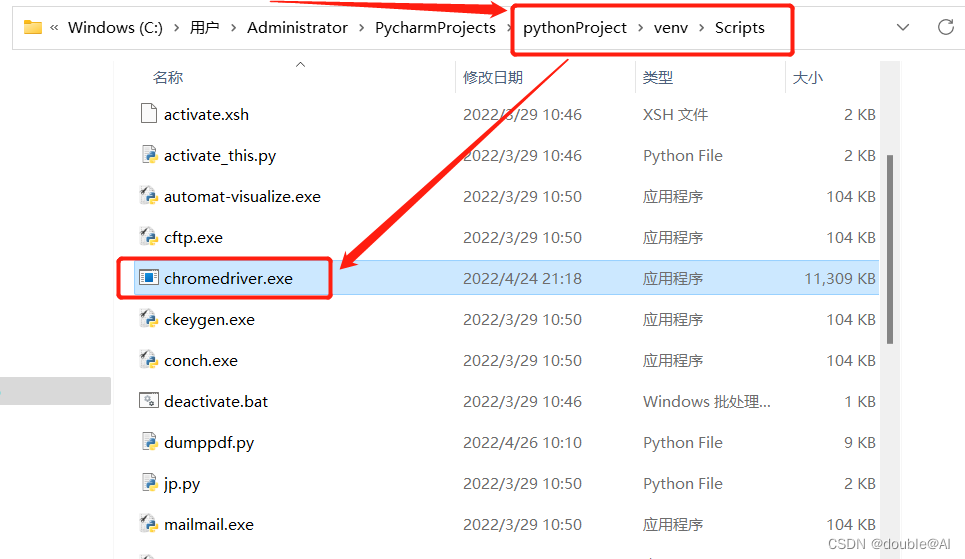 下载完成后会得到chromedriver.exe文件,此时将其复制到python工程目录文件夹中的venv文件夹中的Scripts文件夹下,如图: