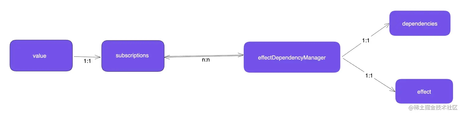 就目前而言,某个响应值被哪些 effect 函数所依赖,这个关系是在创建响应值时候所闭包住的 subscriptions 数组中体现的。而一个 effect 函数所依赖了哪些响应值,这个依赖关系并没有数据结构来体现。所以,我们得先实现这个。我们要在创建 effect 的时候,为每一个 effect 函数创建一个与一一对应的依赖管理器,命名为 effectDependencyManager: