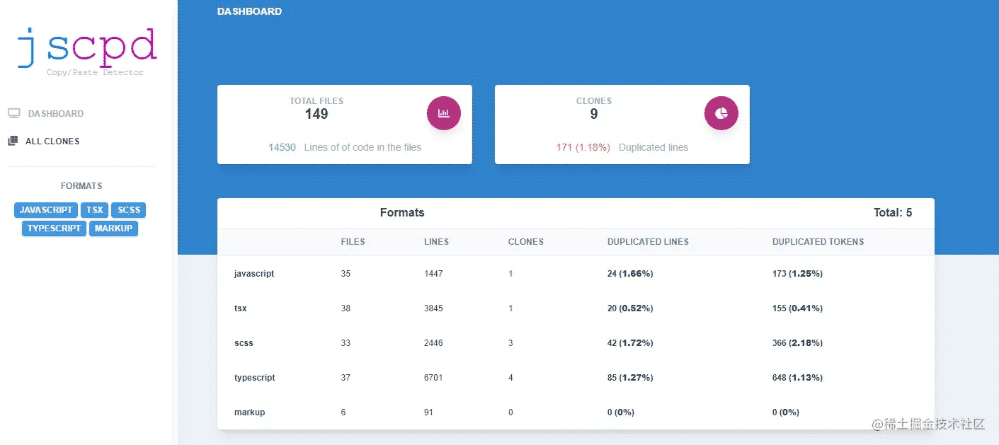 jscpd是一个开源的js工具库,用于检测项目的代码重复率,针对复制粘贴的代码尤其有效,支持超过150种的源码文件格式。